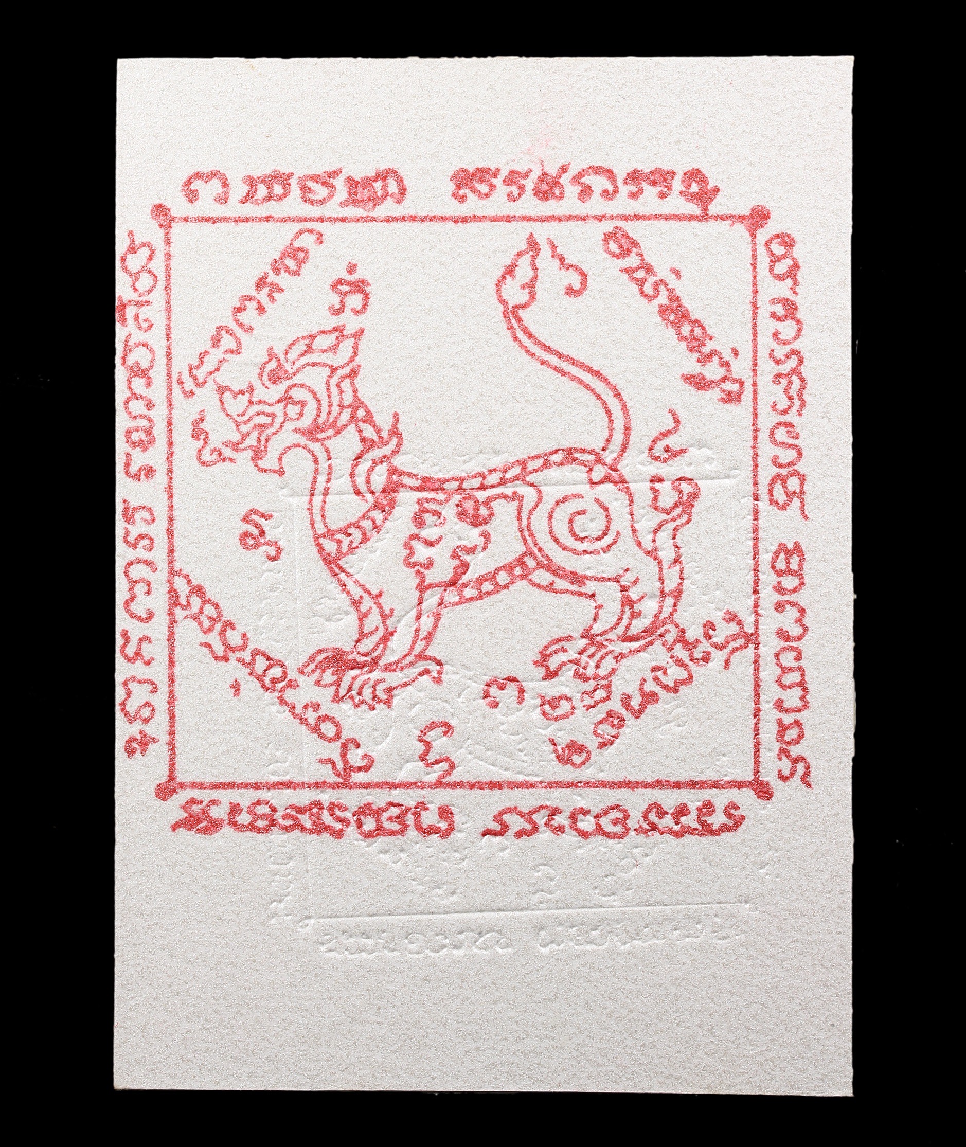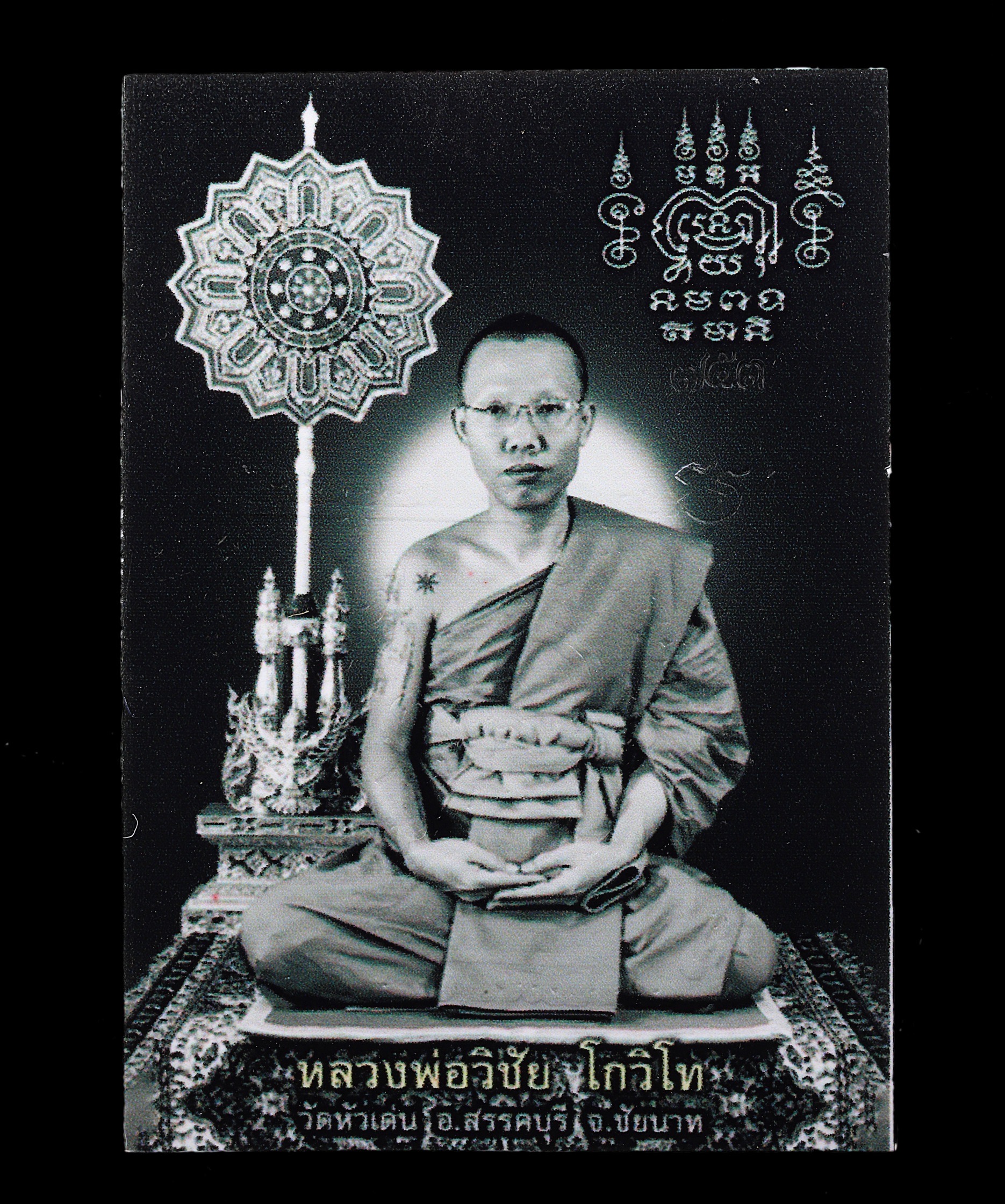 Reverse Design : The “Singh Nopphakao” (Nine-Gem Lion) stamp is a unique hallmark of Wat Hua Den, found on the back of Luang Por Wichai’s photographs and robes.